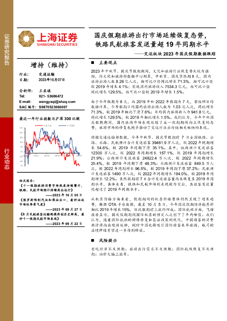 上海证券:交运板块2023年国庆假期数据跟踪:国庆假期旅游出行市场延续恢复态势,铁路民航旅客发送量超19年同期水平.pdf