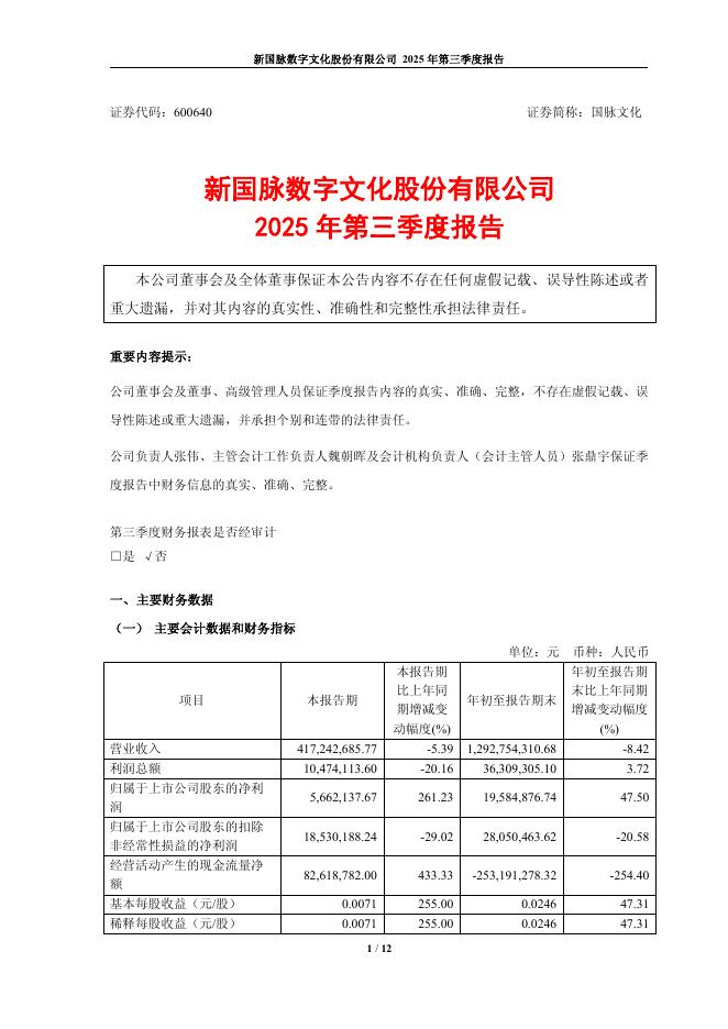 600640-国脉文化:新国脉数字文化股份有限公司2025年第三季度报告.pdf