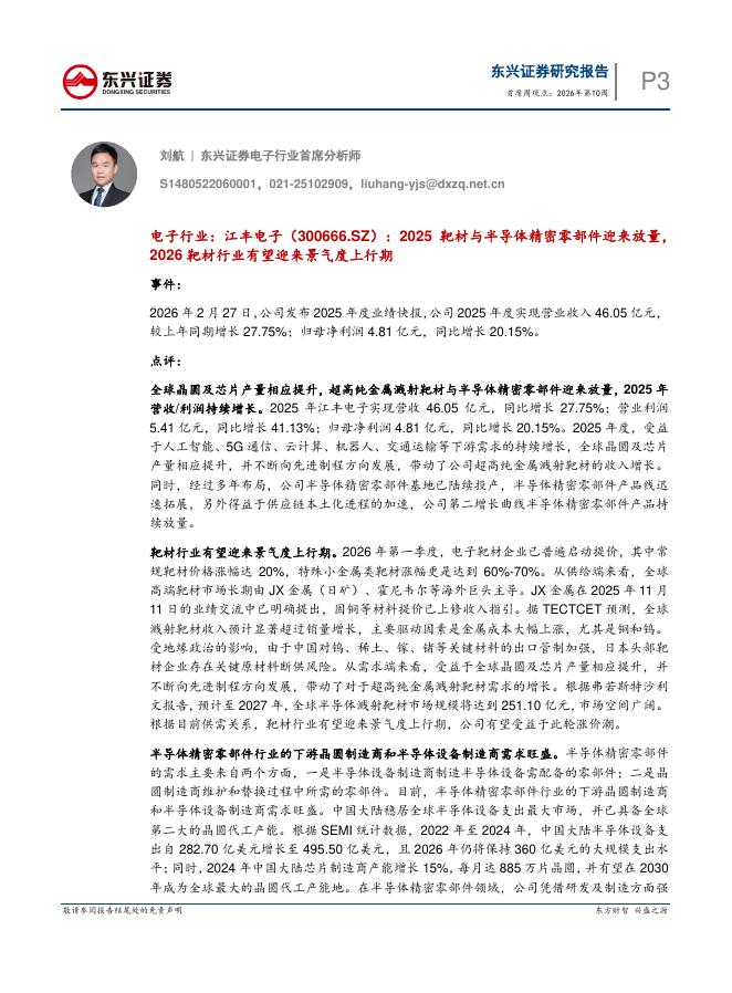 开源证券:电子行业点评报告:JX金属指引明确行业景气度,靶材成为半导体金铲子