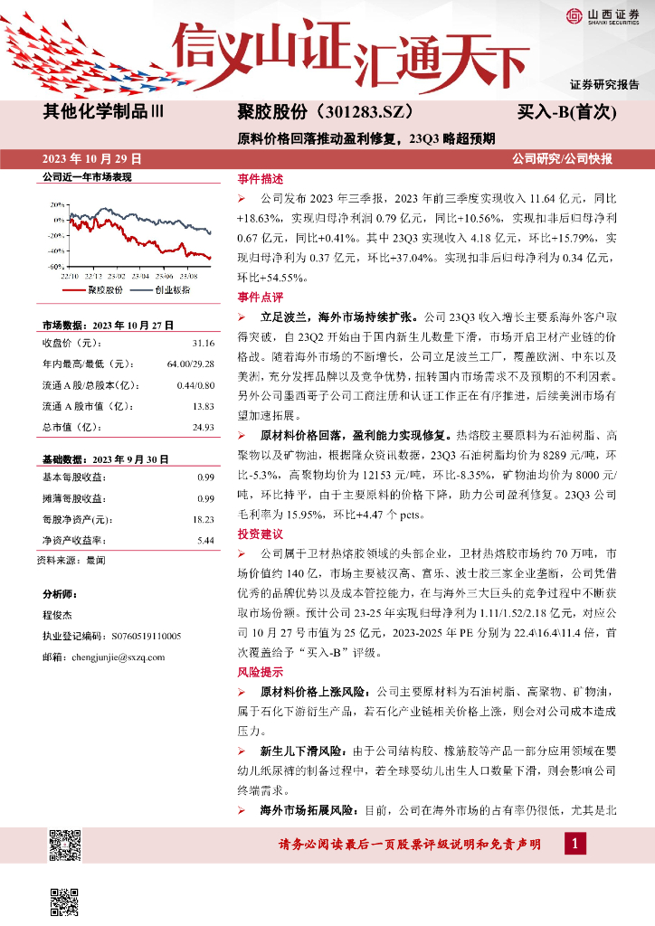山西证券:聚胶股份(301283)-原料价格回落推动盈利修复,23Q3略超预期.pdf