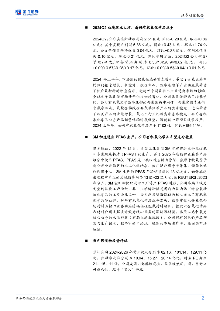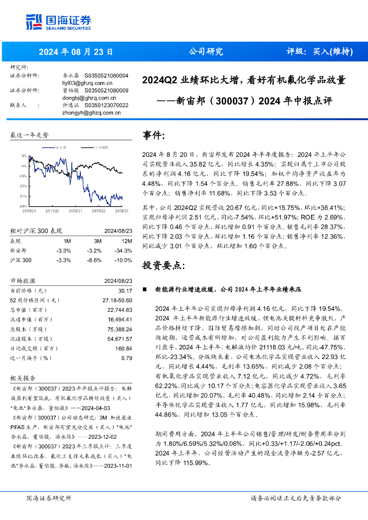 国海证券:新宙邦(300037)-2024年中报点评:2024Q2业绩环比大增,看好有机氟化学品放量.pdf