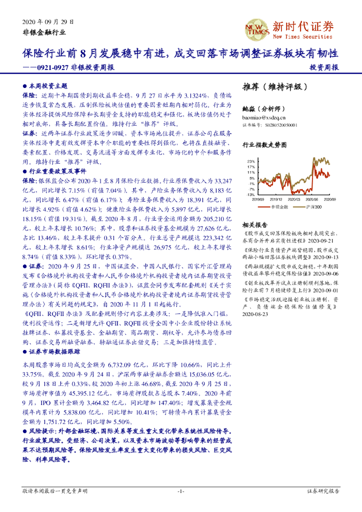新时代证券:非银投资周报:保险行业前8月发展稳中有进,成交回落市场调整证券板块有韧性.pdf