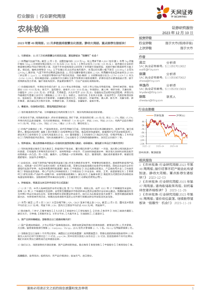 天风证券:农林牧渔2023年第49周周报:11月多数据库能繁去化提速,静待大周期,重点推荐生猪板块!.pdf