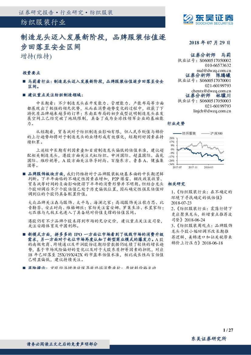 东吴证券:纺织服装行业:制造龙头迈入发展新阶段,品牌服装估值逐步回落至安全区间.pdf