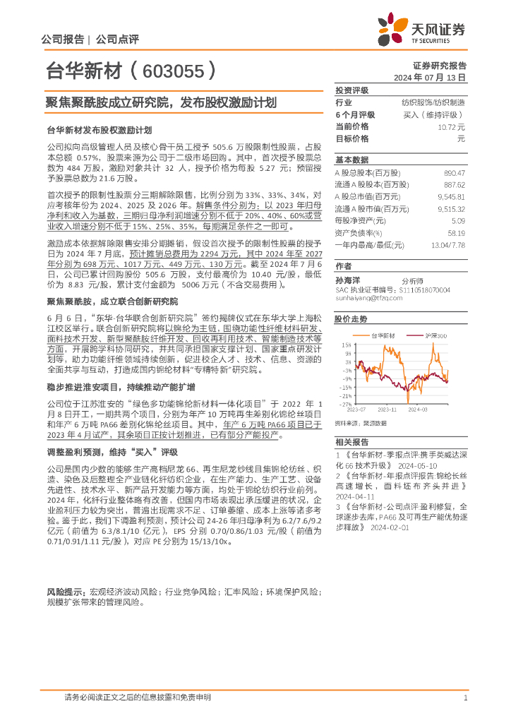天风证券:台华新材(603055)-聚焦聚酰胺成立研究院,发布股权激励计划.pdf