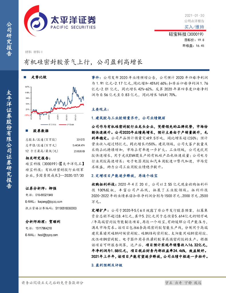 太平洋证券:硅宝科技(300019)-有机硅密封胶景气上行,公司盈利高增长.pdf