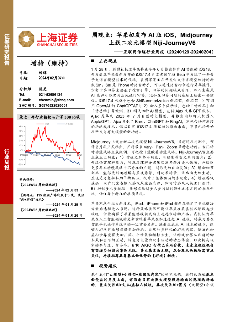上海证券:互联网传媒行业周报-周观点:苹果拟发布AI版iOS,Midjourney上线二次元模型Niji-JourneyV6.pdf