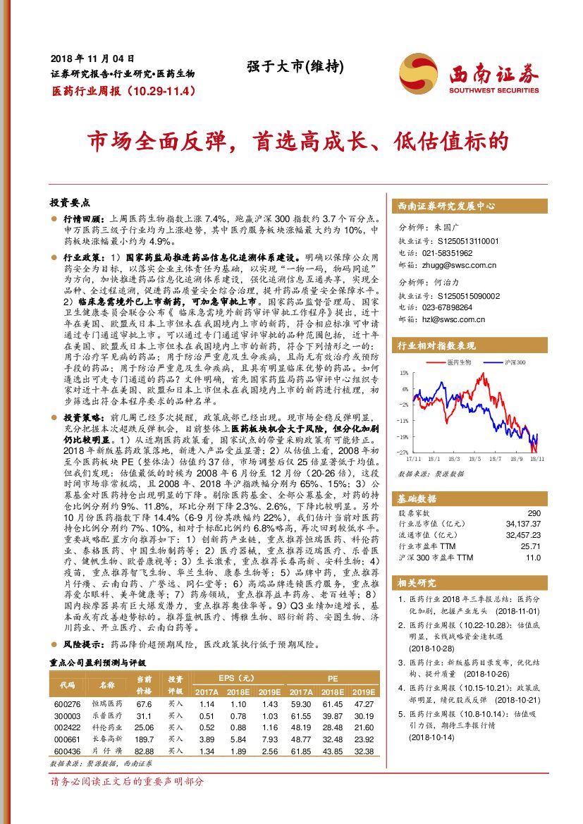 西南证券:医药行业周报:市场全面反弹,首选高成长、低估值标的.pdf
