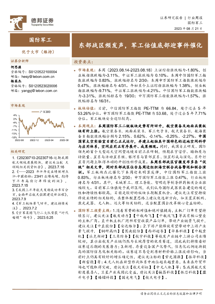 德邦证券:国防军工行业周报:东部战区频发声,军工估值底部迎事件催化.pdf