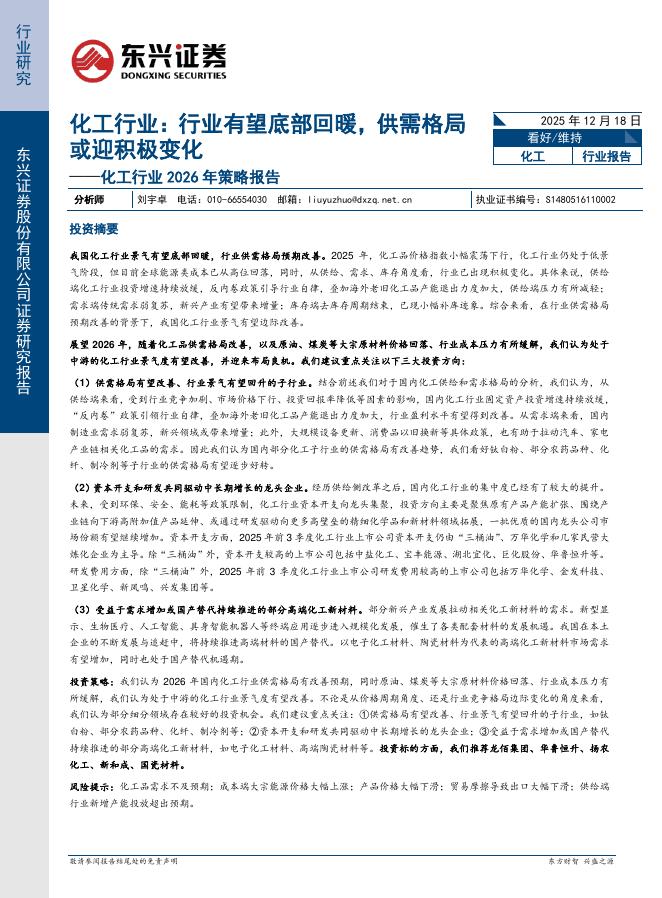 东兴证券:化工行业2026年策略报告:行业有望底部回暖,供需格局或迎积极变化.pdf