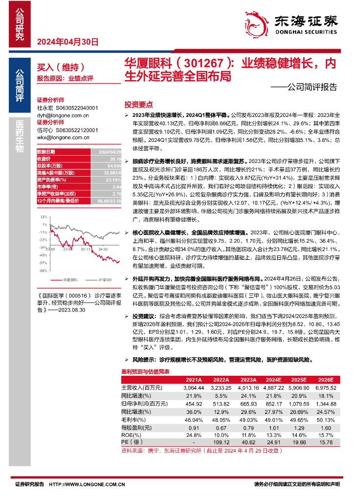 东海证券:华厦眼科(301267)-公司简评报告:业绩稳健增长,内生外延完善全国布局.pdf