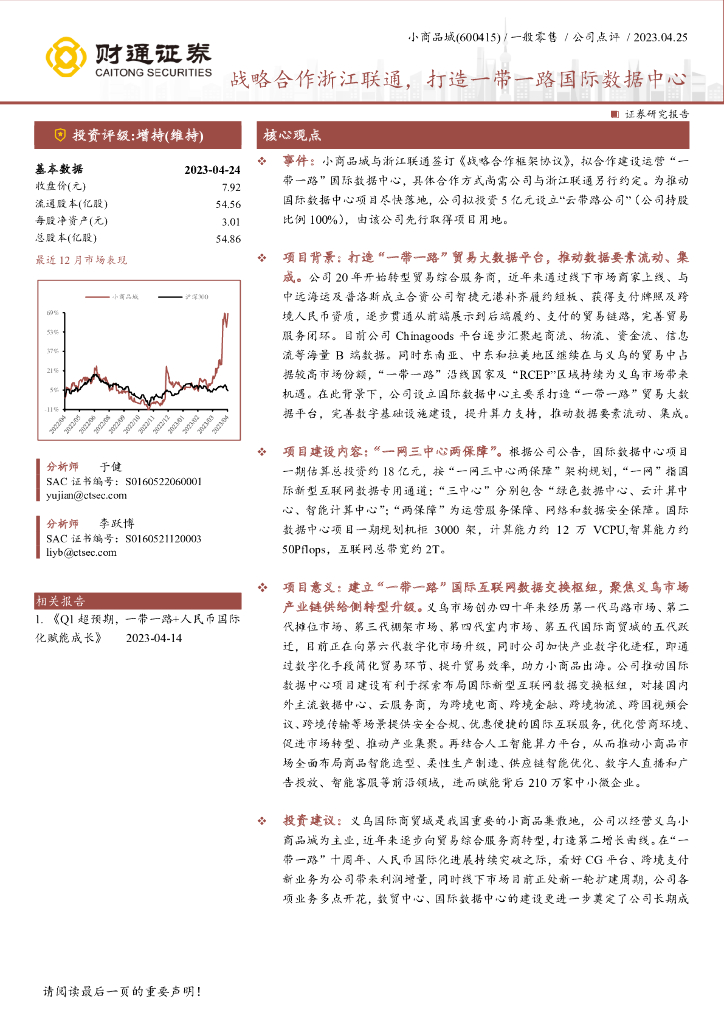 财通证券:小商品城(600415)-战略合作浙江联通,打造一带一路国际数据中心.pdf