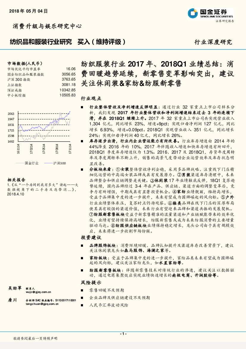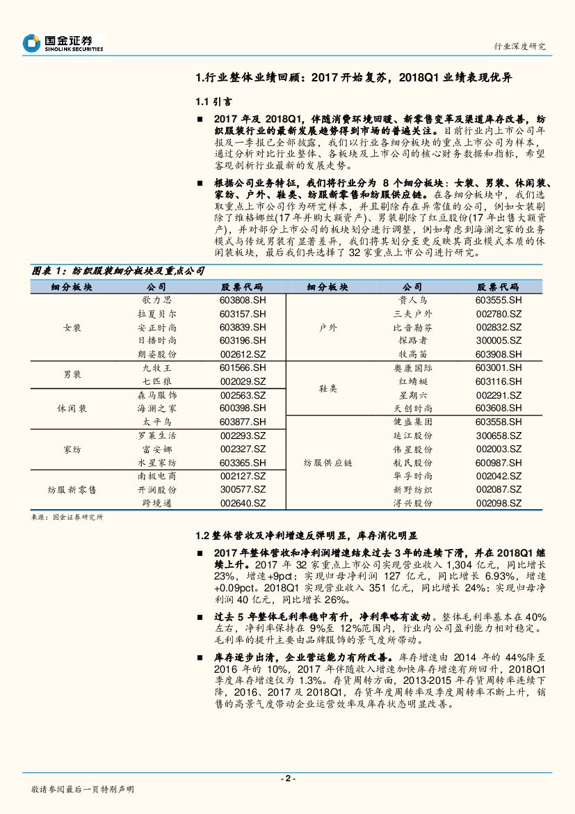 国金证券:纺织服装行业2017年、2018Q1业绩总结:消费回暖趋势延续,新零售变革影响突出,建议关注休闲装&家纺&纺服新零售.pdf