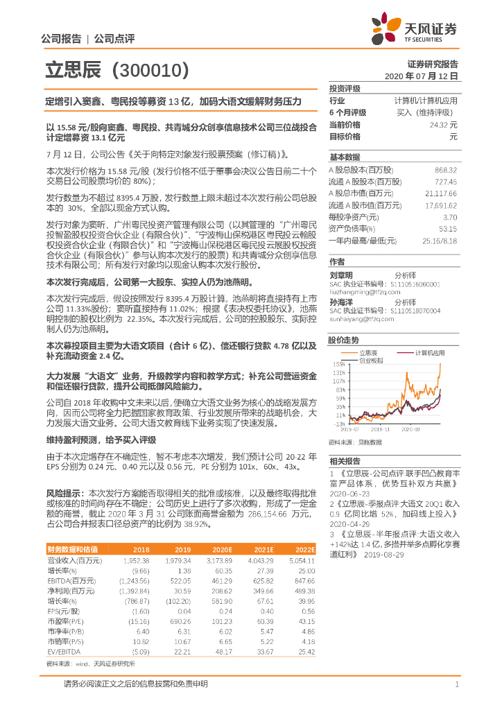 天风证券:立思辰(300010)-定增引入窦鑫、粤民投等募资13亿,加码大语文缓解财务压力.pdf