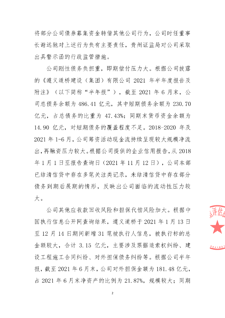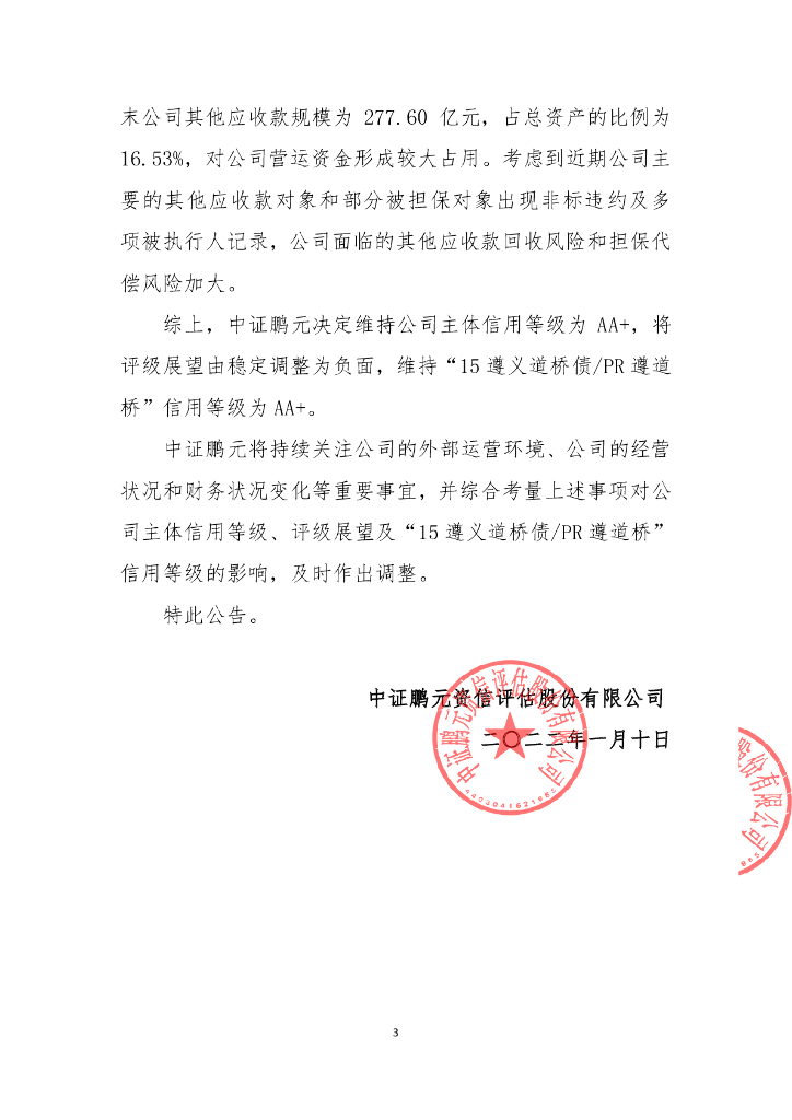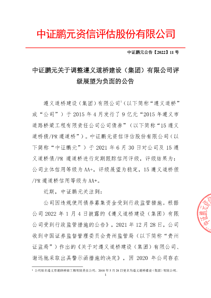鹏元:中证鹏元关于调整遵义道桥建设(集团)有限公司评级展望为负面的公告.pdf