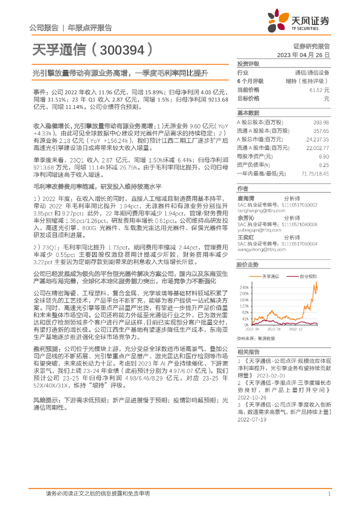 天风证券:天孚通信(300394)-光引擎放量带动有源业务高增,一季度毛利率同比提升.pdf