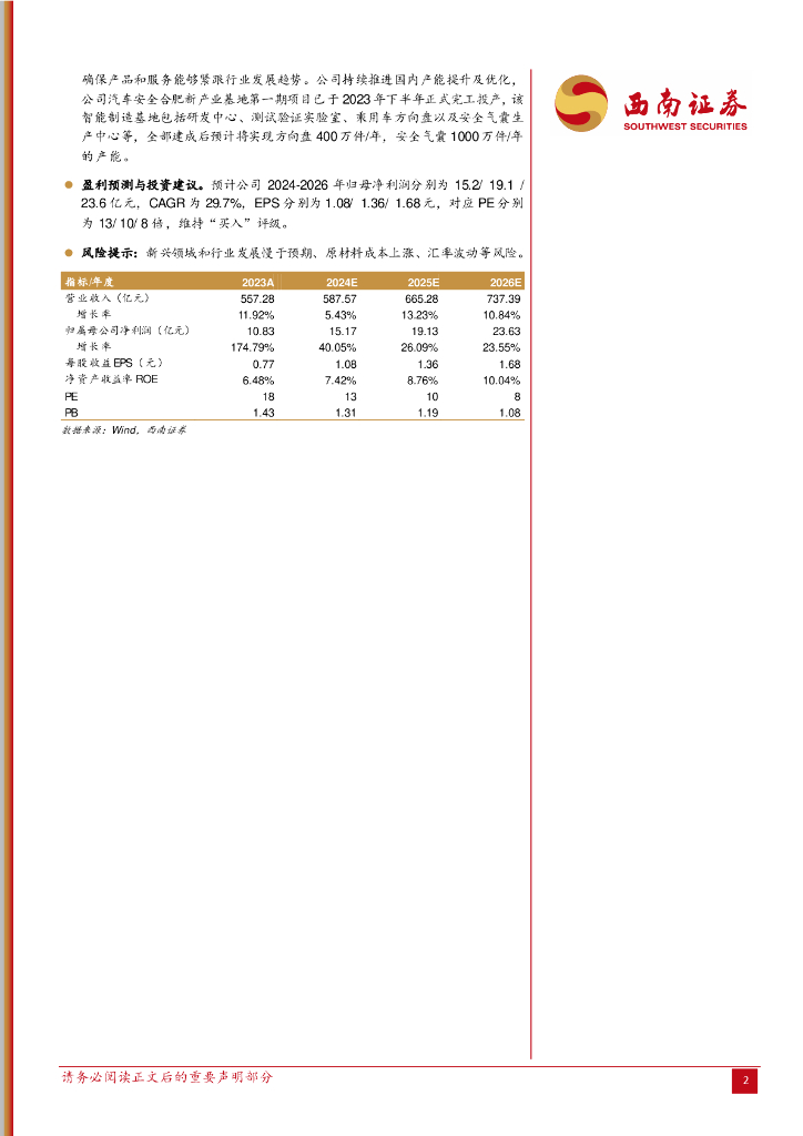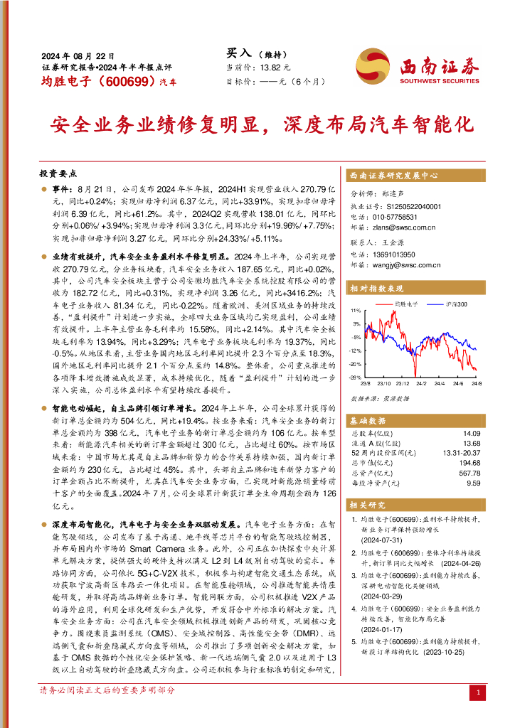 西南证券:均胜电子(600699)-2024年半年报点评:安全业务业绩修复明显,深度布局汽车智能化.pdf