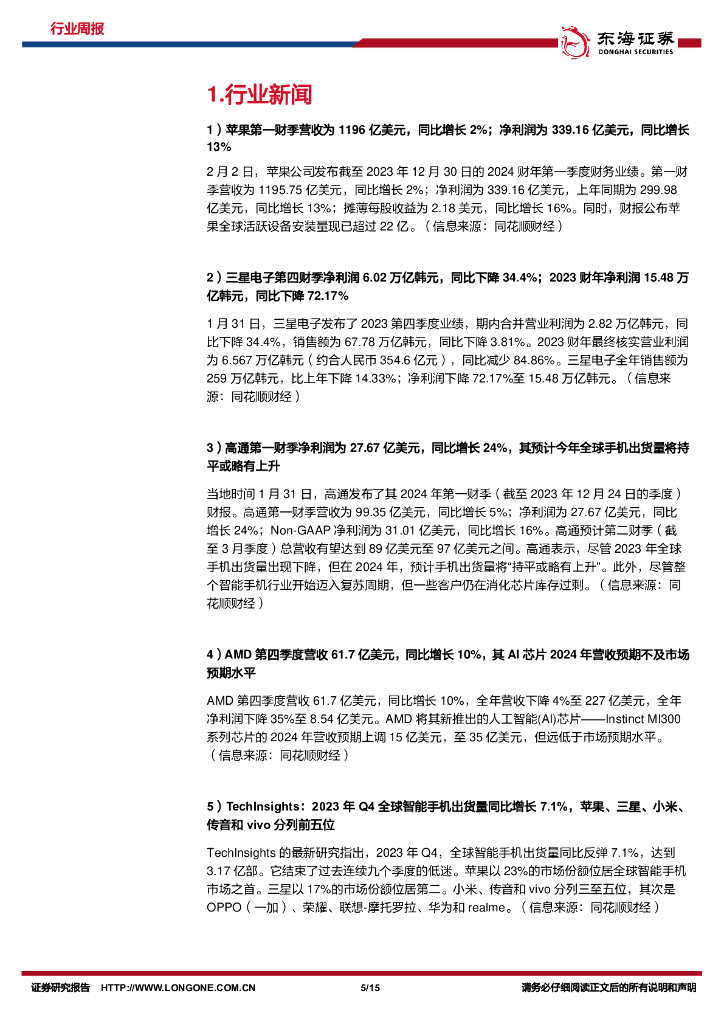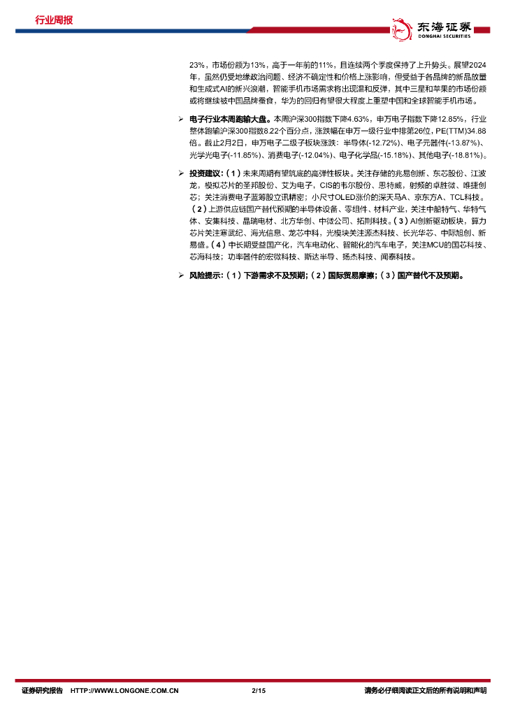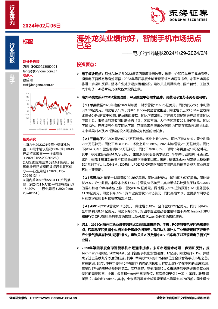 东海证券:电子行业周报2024/1/29-2024/2/4:海外龙头业绩向好,智能手机市场拐点已至.pdf