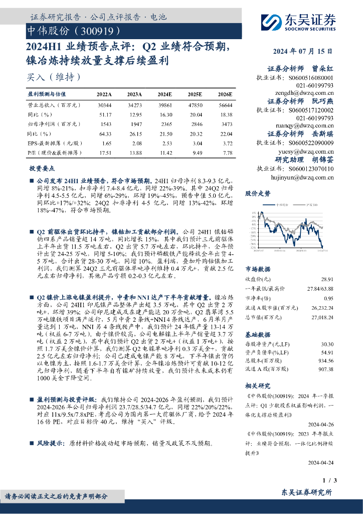 东吴证券:中伟股份(300919)-2024H1业绩预告点评:Q2业绩符合预期,镍冶炼持续放量支撑后续盈利.pdf