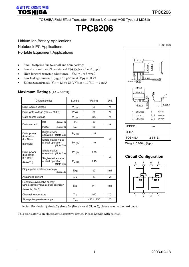TOSHIBA Field Effect Transistor Silicon N Channel MOS Type (U-MOSII) TPC8206 数据手册.pdf