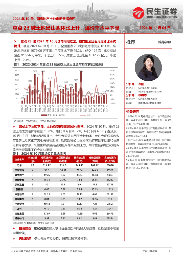 民生证券:2024年10月中国房地产土地市场数据点评:重点23城土地出让金环比上升,溢价率水平下降.pdf