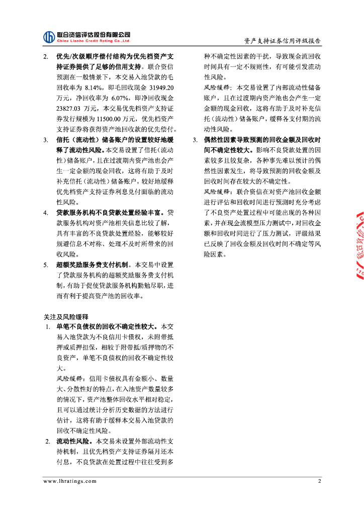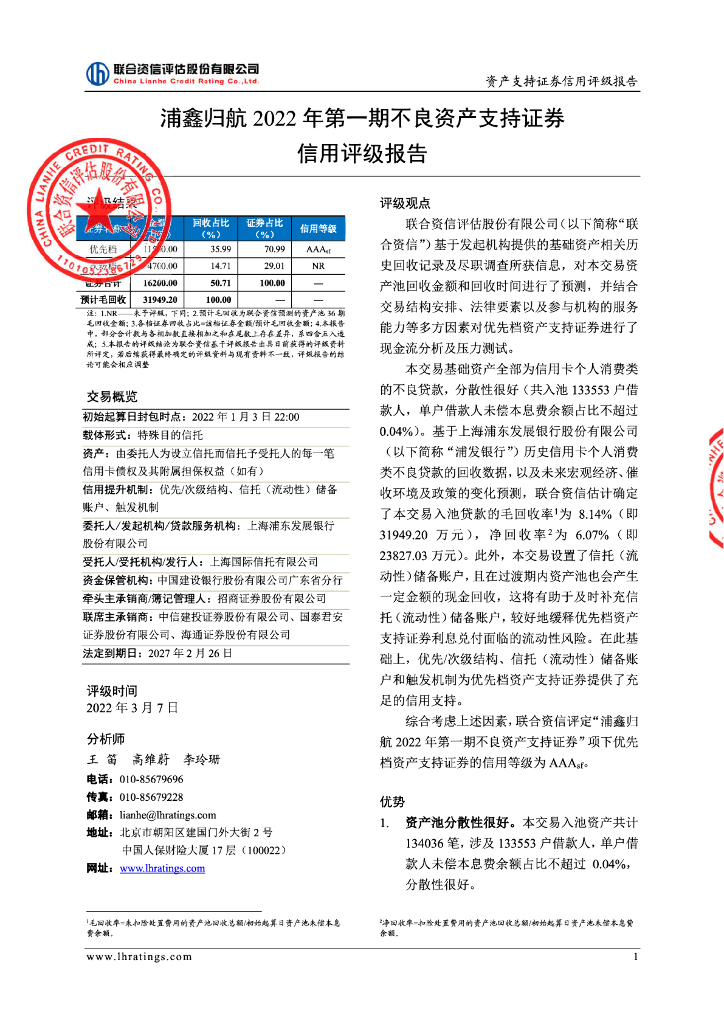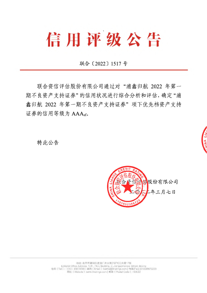 联合资信:浦鑫归航2022年第一期不良资产支持证券信用评级报告及跟踪评级安排.pdf