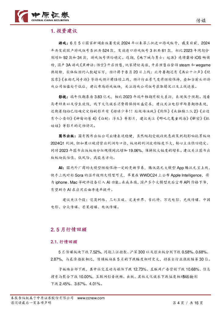 中原证券:传媒行业月报:暑期文化娱乐消费旺季将至,关注电影、游戏定档进展.pdf