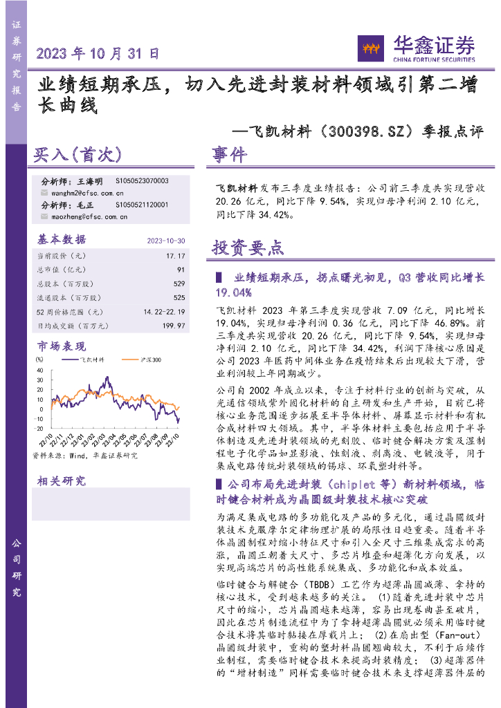 华鑫证券:飞凯材料(300398)-公司事件点评报告:业绩短期承压,切入先进封装材料领域引第二增长曲线.pdf