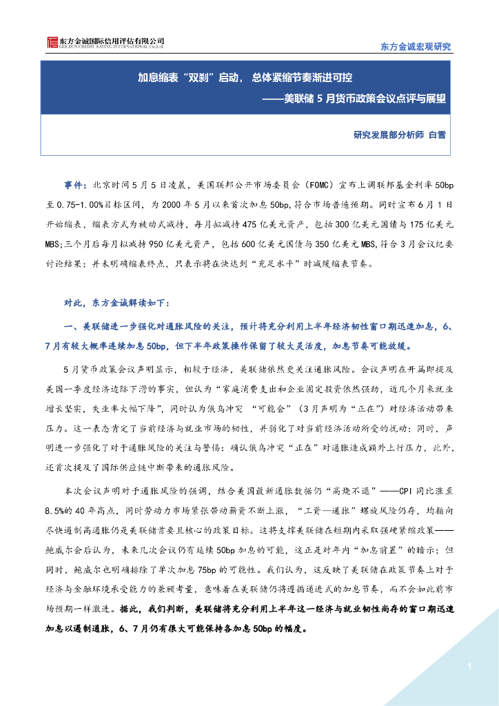 东方金诚:宏观研究 美联储5月货币政策会议点评与展望:加息缩表“双刹”启动,总体紧缩节奏渐进可控.pdf