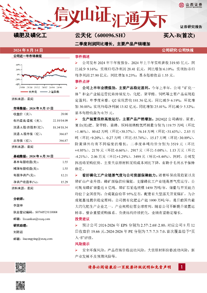 山西证券:云天化(600096)-二季度利润同比增长,主要产品产销增加.pdf