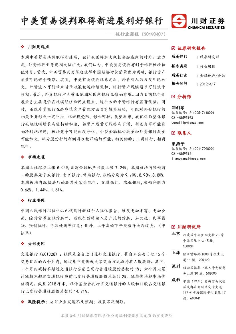 川财证券:银行业周报:中美贸易谈判取得新进展利好银行.pdf