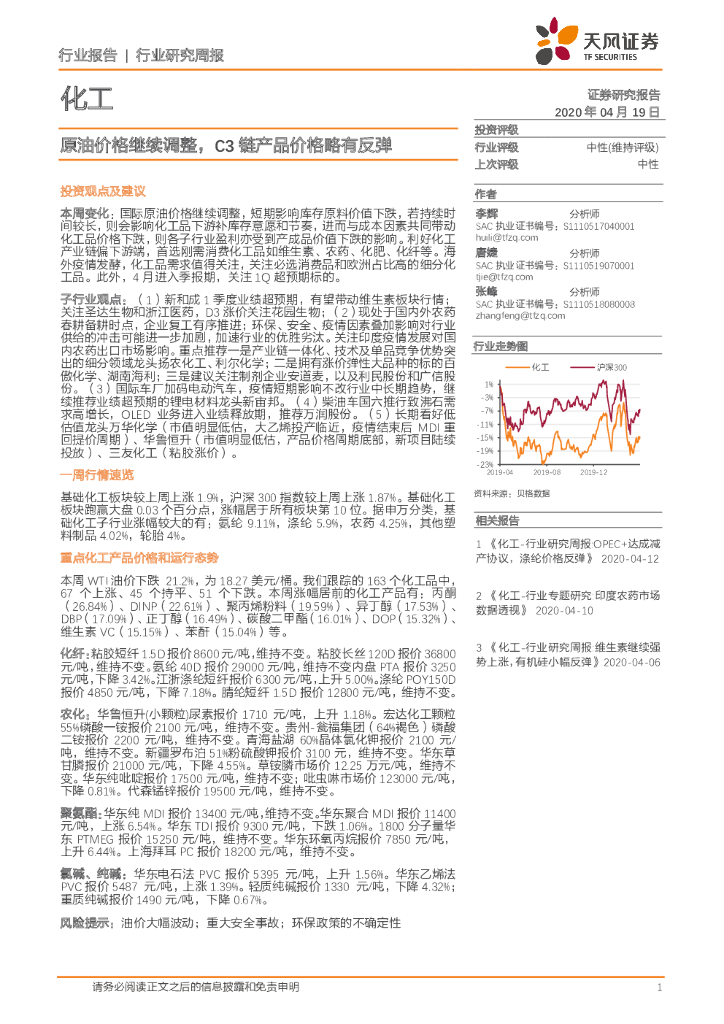 天风证券:化工行业研究周报:原油价格继续调整,C3链产品价格略有反弹.pdf
