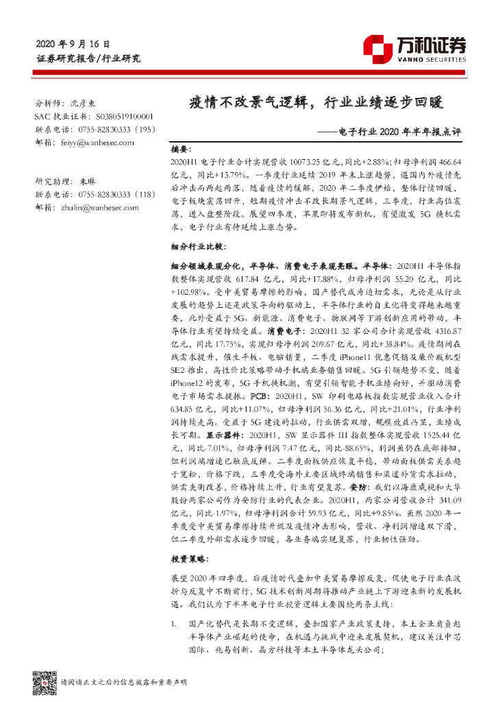 万和证券:电子行业2020年半年报点评:疫情不改景气逻辑,行业业绩逐步回暖.pdf