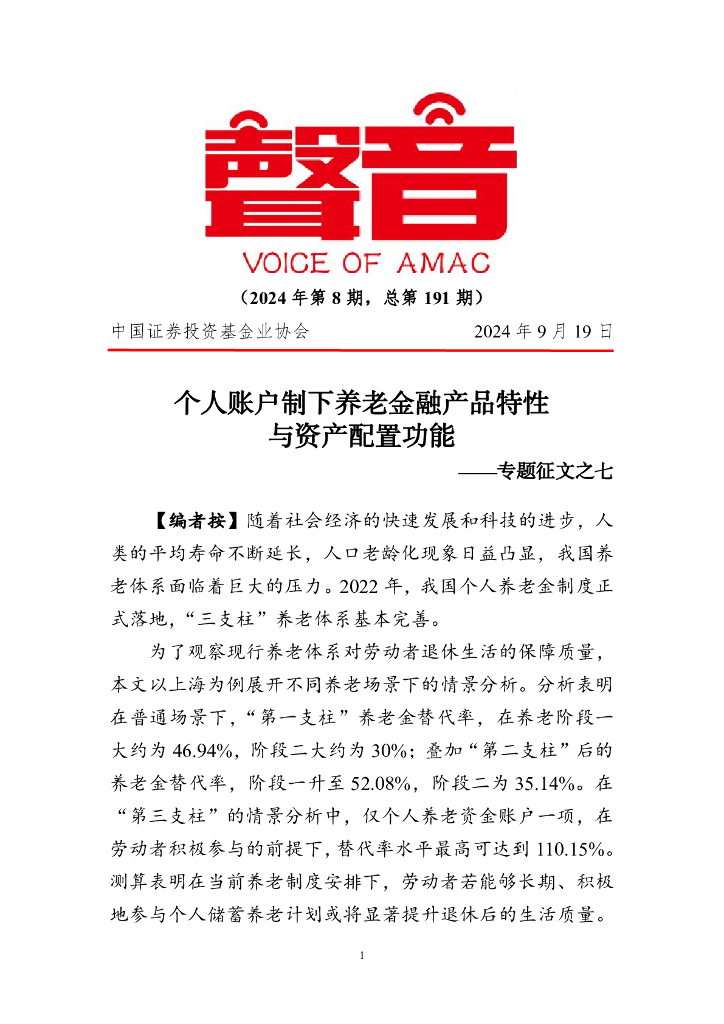 中国证券投资基金业协会:《声音》2024年第8期专题征文之七:个人账户制下养老金融产品特性与资产配置功能.pdf
