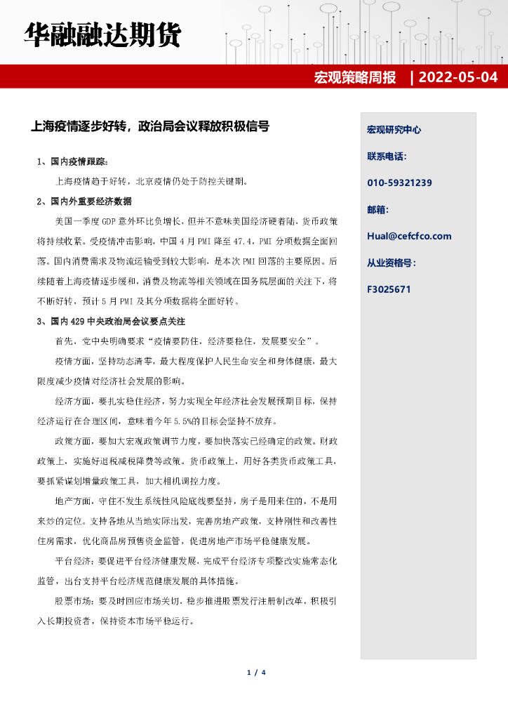 华融融达期货:宏观策略周报:上海疫情逐步好转,政治局会议释放积极信号.pdf