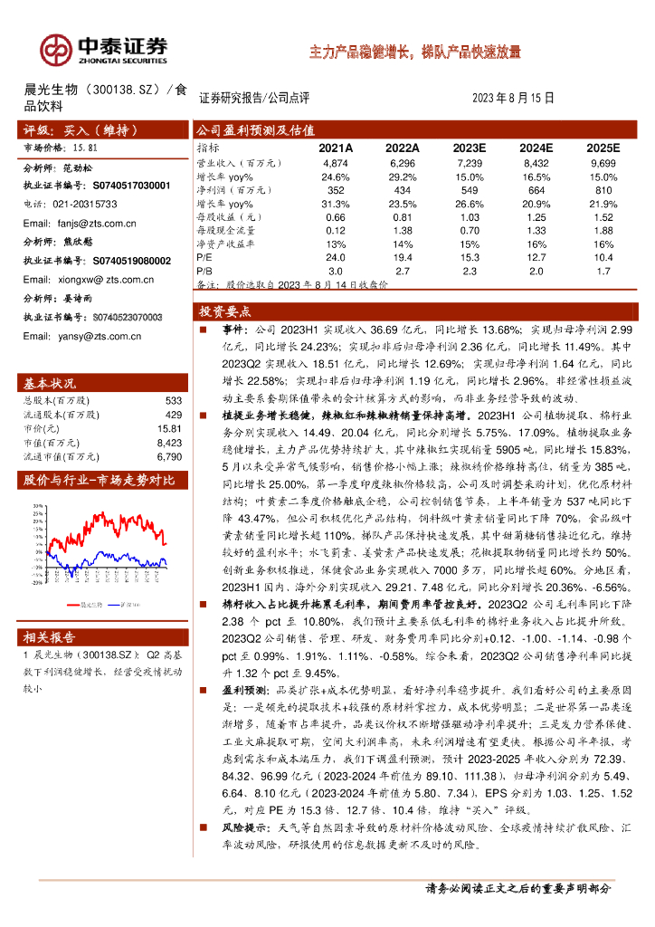 中泰证券:晨光生物(300138)-主力产品稳健增长,梯队产品快速放量.pdf