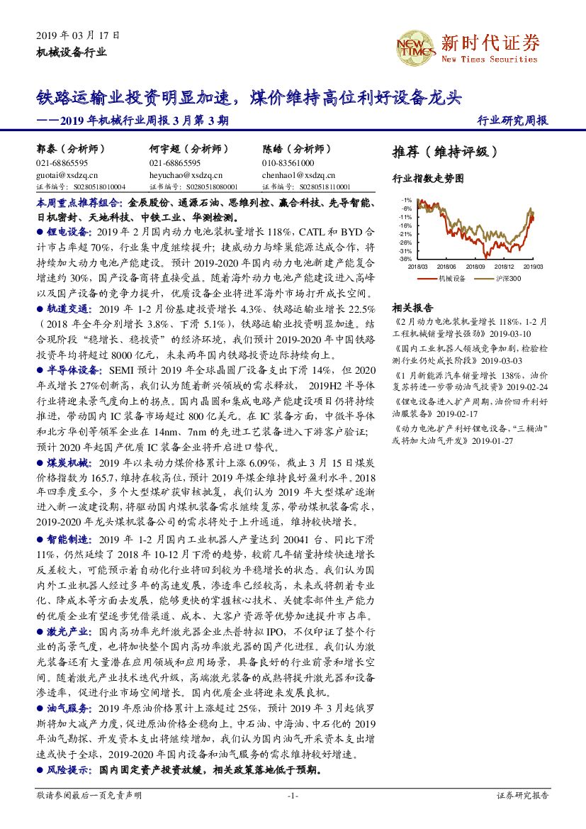 新时代证券:2019年机械行业周报3月第3期:铁路运输业投资明显加速,煤价维持高位利好设备龙头.pdf