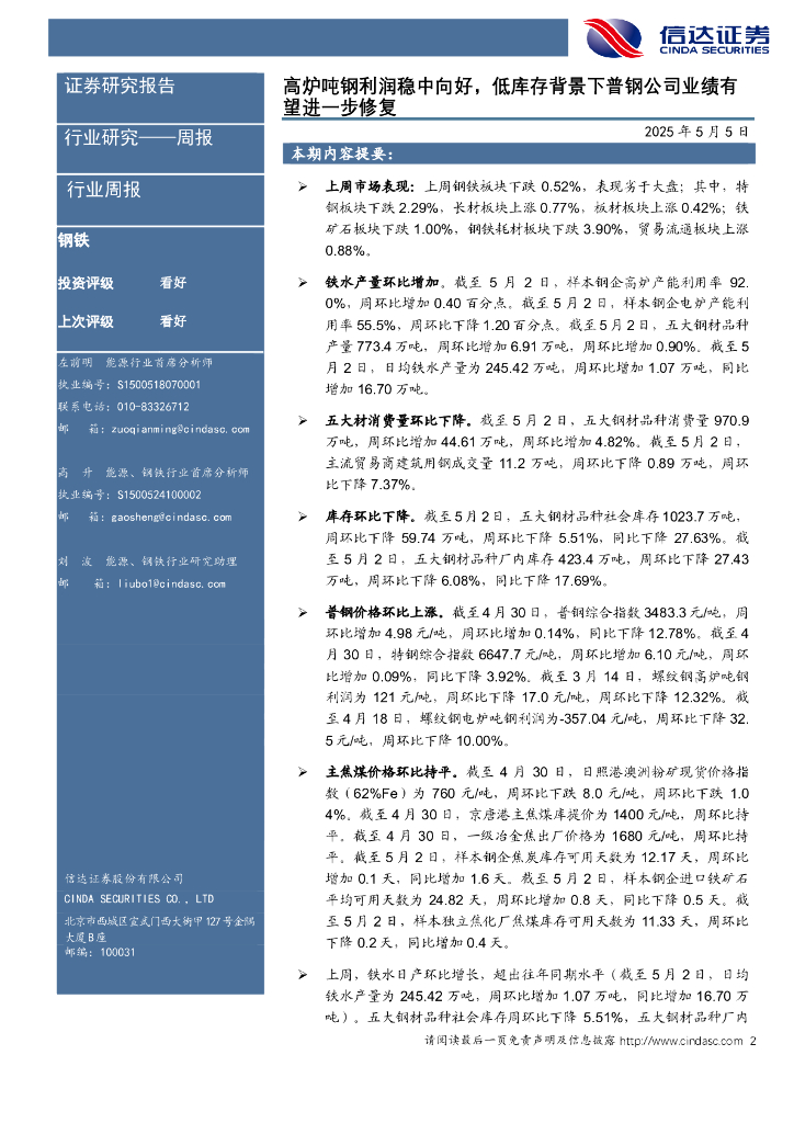 信达证券:高炉吨钢利润稳中向好,低库存背景下普钢公司业绩有望进一步修复钢铁.pdf
