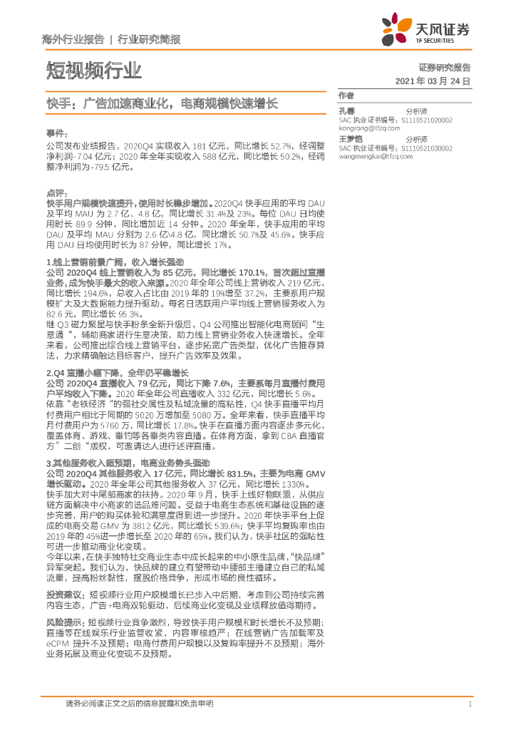 天风证券:短视频行业:快手:广告加速商业化,电商规模快速增长.pdf