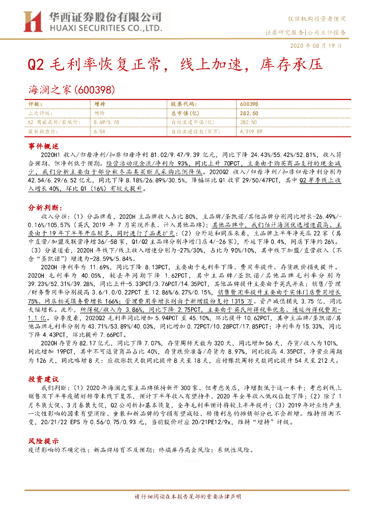 华西证券:海澜之家(600398)-Q2毛利率恢复正常,线上加速,库存承压.pdf
