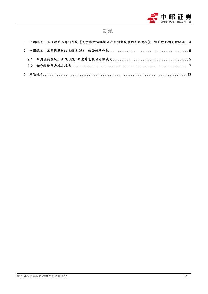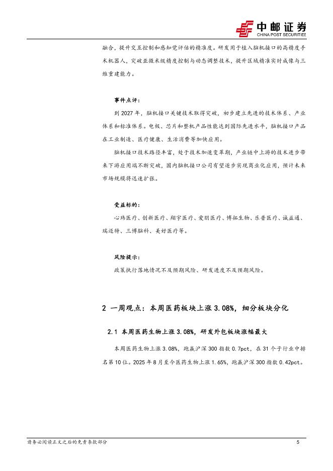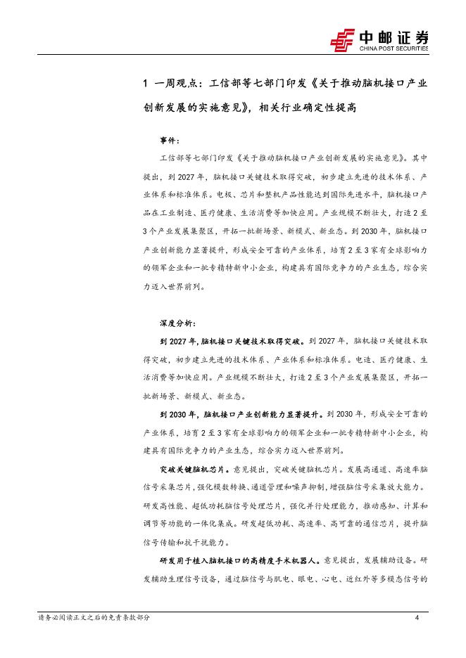 中邮证券:医药生物行业报告:工信部等七部门印发《关于推动脑机接口产业创新发展的实施意见》,相关行业确定性提高.pdf