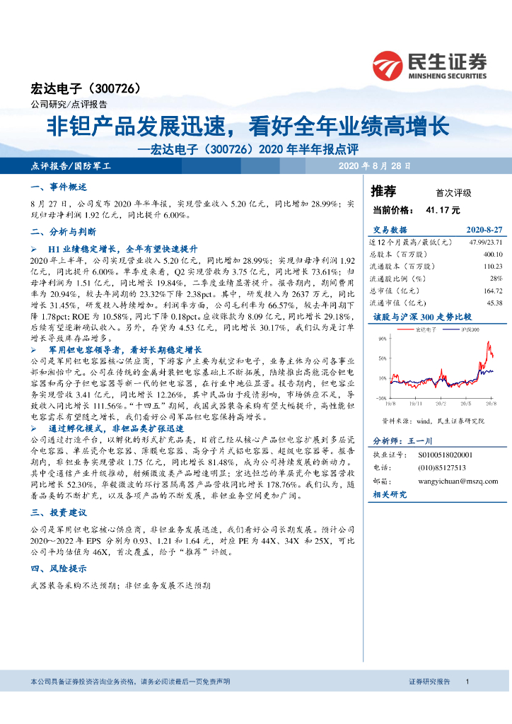 民生证券:宏达电子(300726)-2020年半年报点评:非钽产品发展迅速,看好全年业绩高增长.pdf
