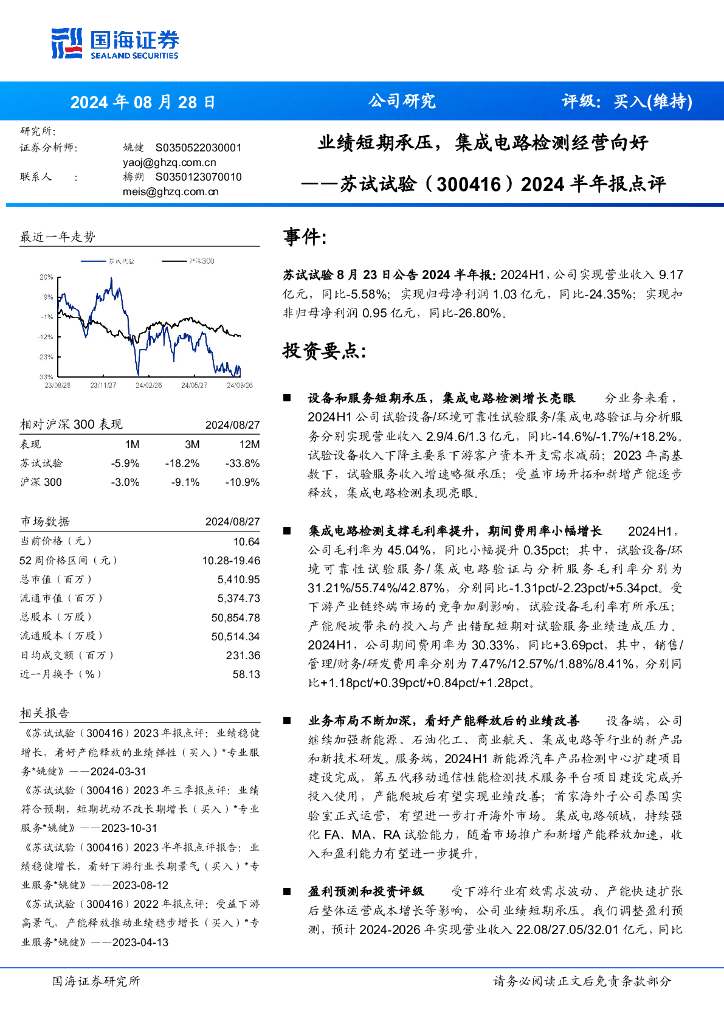 国海证券:苏试试验(300416)-2024半年报点评:业绩短期承压,集成电路检测经营向好.pdf