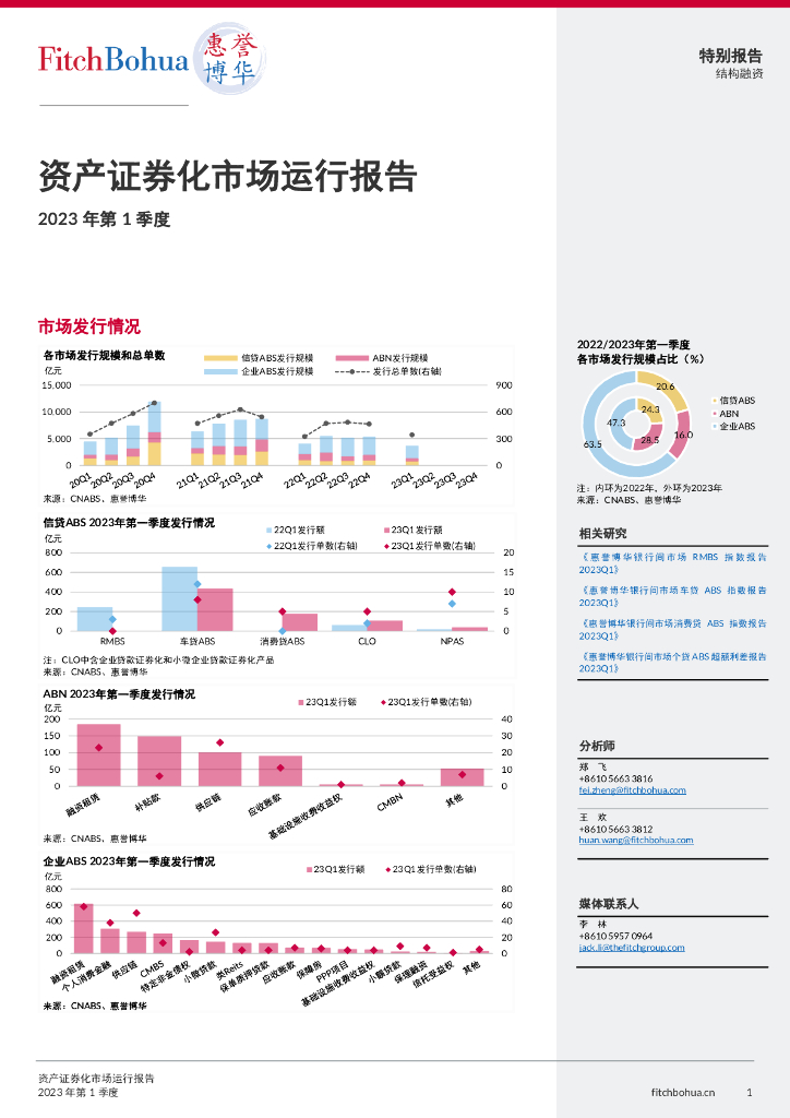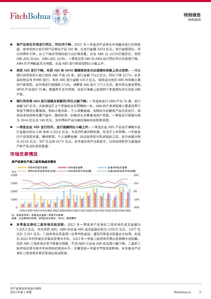 资产证券化市场发行同比、环比均下降:2023年一季度资产证券化市场整体发行仍然低迷,全市场共计发行资产证券化产品342单,总发行金额3,676亿元,发行金额同比">