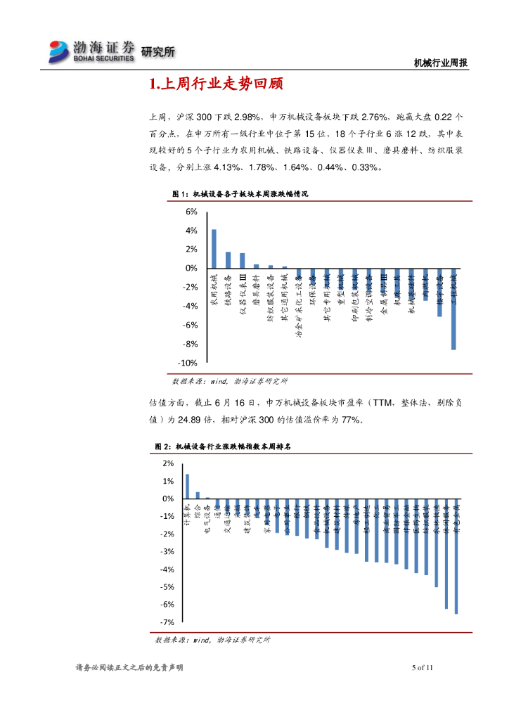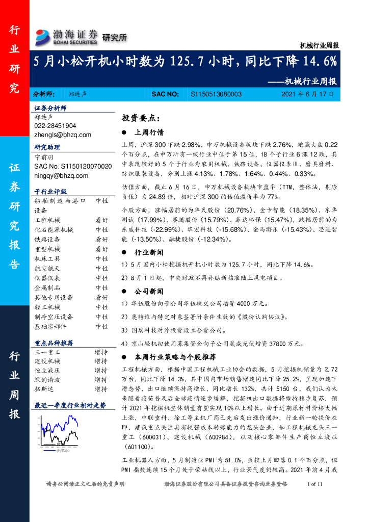 渤海证券:机械行业周报:5月小松开机小时数为125.7小时,同比下降14.6%.pdf