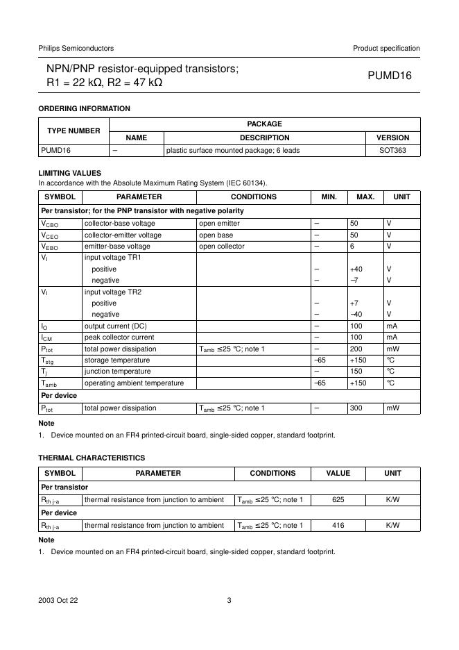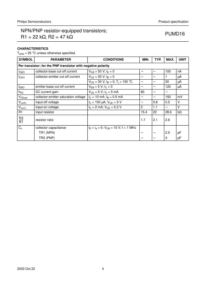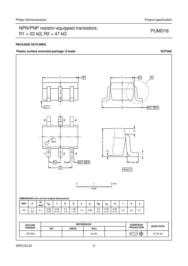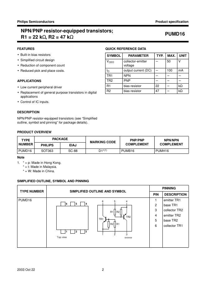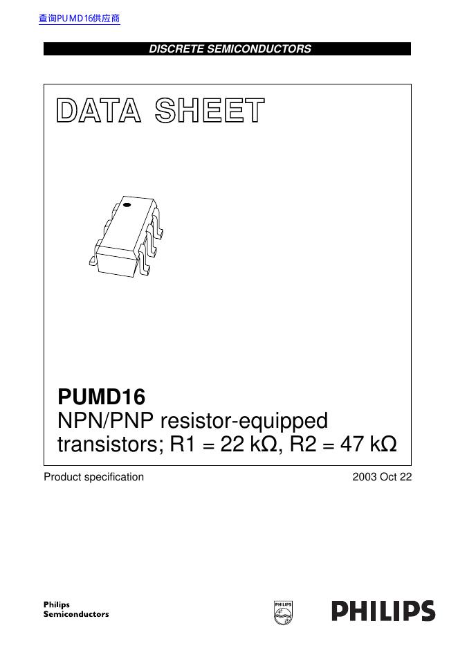 PHILIPS PUMD16 NPN/PNP resistor-equipped transistors; R1 = 22 kΩ, R2 = 47 kΩ 数据手册.pdf