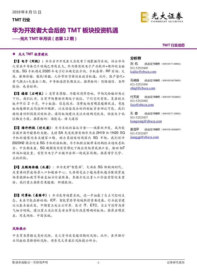 光大证券:光大TMT半月谈(总第12期):华为开发者大会后的TMT板块投资机遇.pdf