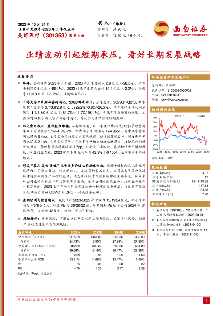 西南证券:美好医疗(301363)-2023年三季报点评:业绩波动引起短期承压,看好长期发展战略.pdf