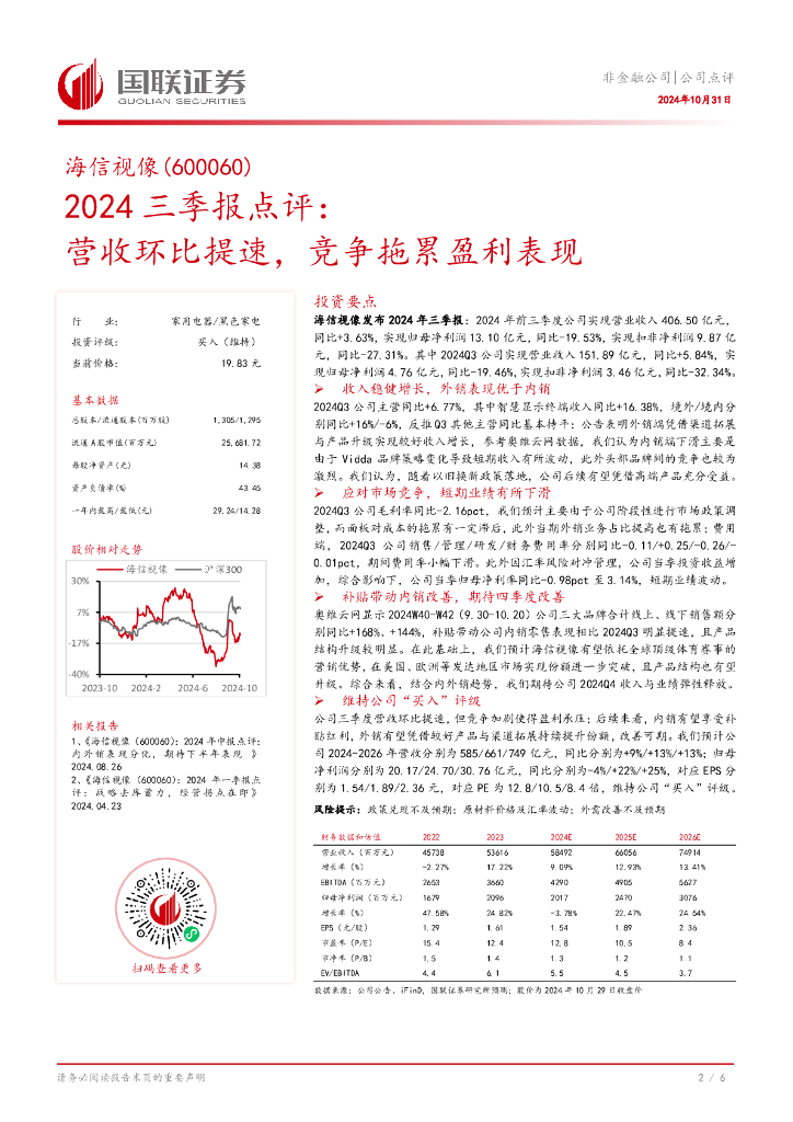 国联证券:海信视像(600060)-2024三季报点评:营收环比提速,竞争拖累盈利表现.pdf
