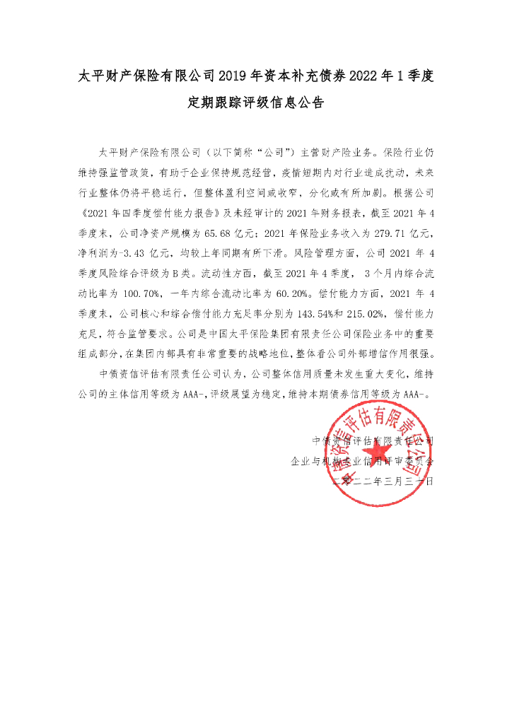中债资信:太平财产保险有限公司2019年资本补充债券2022年1季度定期跟踪评级信息公告.pdf